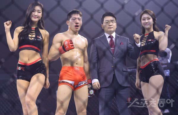 20일 오후 서울 강서구 화곡동 KBS 아레나홀에서 진행된 글리몬FC 02(GFC 02) 노바매치 임정민과 정지환의 벤텀급 2경기에서 임정민이 판정승을 거뒀다. 경기 후 임정민이 글리몬 걸들과 함께 포즈를 취하고 있다.