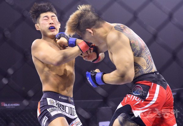 0일 오후 서울 강서구 화곡동 KBS 아레나홀에서 열린 글리몬FC 02(GFC 02) 메인매치 홍성호와 이성종의 라이트급 3경기에서 이성종이 홍성호에게 강력한 펀치를 때리고 있다.