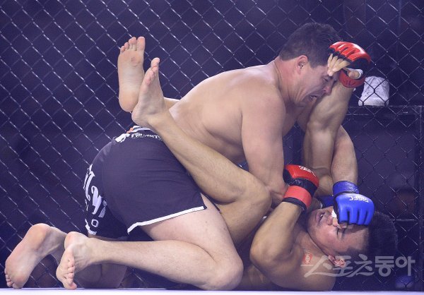 20일 오후 서울 강서구 화곡동 KBS 아레나홀에서 열린 글리몬FC 02(GFC 02) 메인매치 안상일과 이스마일로프 누르백의 라이트헤비급 5경기에서 누르백과 안상일이 치열한 경기를 펼치고 있다. 누르백은 3라운드 레프리 스톱 TKO 승리를 거뒀다.