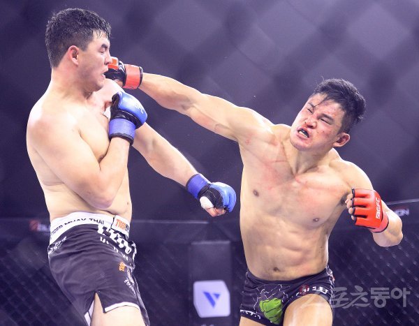 20일 오후 서울 강서구 화곡동 KBS 아레나홀에서 열린 글리몬FC 02(GFC 02) 메인매치 안상일과 이스마일로프 누르백의 라이트헤비급 5경기에서 안상일이 누르백에게 강력한 펀치를 날리고 있다. 누르백은 3라운드 레프리 스톱 TKO 승리를 거뒀다.