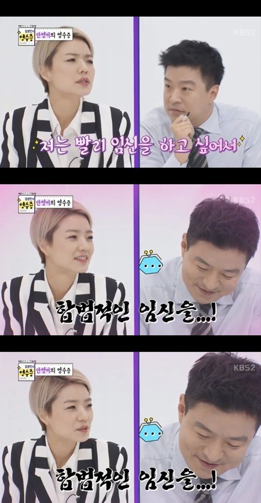그는 “언제 가장 결혼하고 싶으냐”는 김생민의 질문에 “일단 빨리 임신을 하고 싶다. 합벅적인 임신을 하고 싶다”고 말했다. 당황한 김생민은 “너무 자극적”이라고 난감해했다.