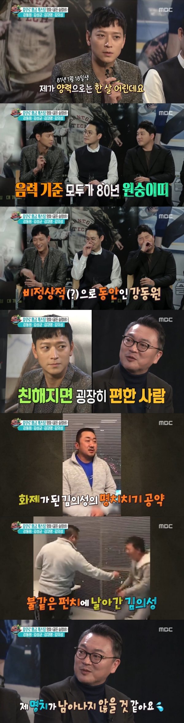 ‘부산행’에 이어 ‘범죄도시’에서 ‘명존세’(명치를 정말 세게 때리는 것) 공약을 걸었다가 실제로 마동석에게 명치를 맞았던 김의성. 그는 이번에도 ‘명존세’ 공약을 걸어달라는 요청에 “재미삼아 했는데 그 영상이 계속 남더라. 사실 좀 불편하다. 출연하는 작품마다 명치를 맞으면 내 명치가 남아나지 않을 것”이라고 받아쳤다. 이에 강동원은 “그렇다면 ‘얼존세’는 어떠냐”고 농담했다. 명치 대신 얼굴을 맞자는 것. 김의성은 “이봐”라고 발끈했고 강동원은 곧장 사과해 웃음을 자아냈다.