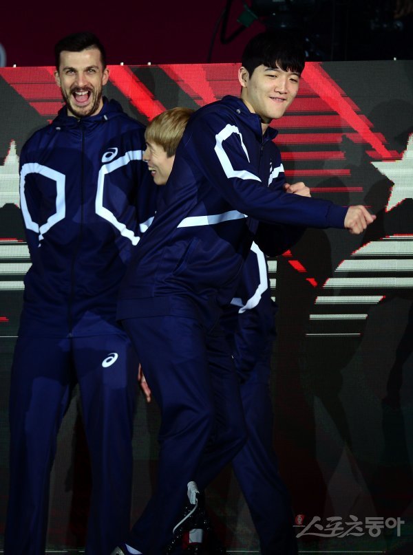 21일 경기도 의정부체육관에서 ‘2017-2018 도드람 V리그 올스타전’ K-스타와 V-스타의 경기가 열렸다. V-스타 정지석이 입장단상에서 댄스를 선보이고 있다.