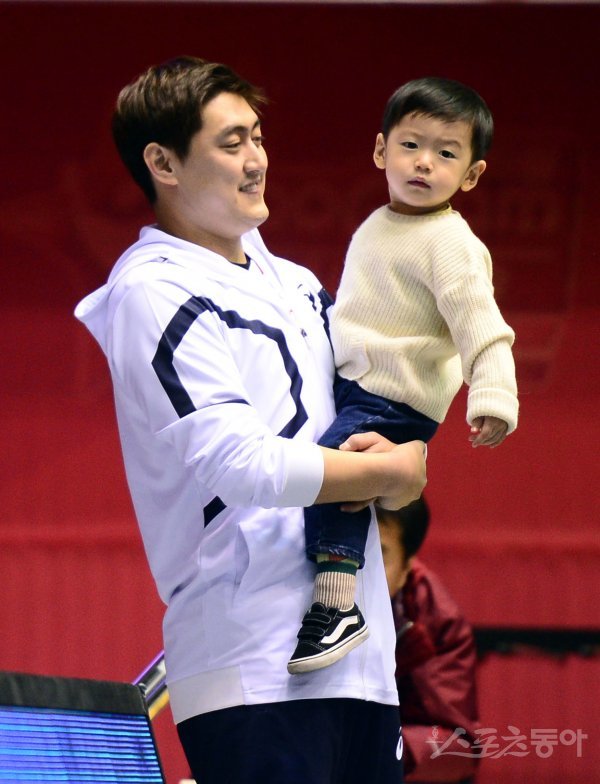 21일 경기도 의정부체육관에서 ‘2017-2018 도드람 V리그 올스타전’ K-스타와 V-스타의 경기가 열렸다. 유광우가 아들을 안고 경기를 지켜보고 있다.
