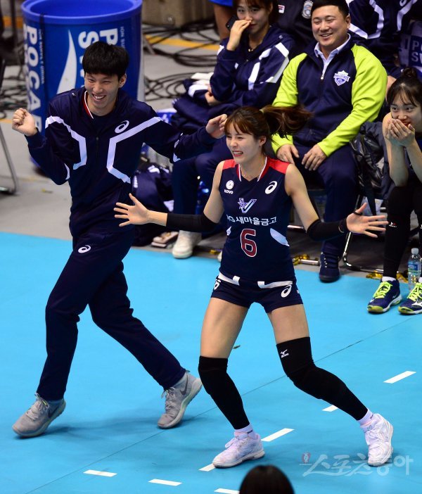 21일 경기도 의정부체육관에서 ‘2017-2018 도드람 V리그 올스타전’ K-스타와 V-스타의 경기가 열렸다. V-스타 황택의와 이다영이 ‘뉴페이스’ 댄스를 선보이고 있다.
