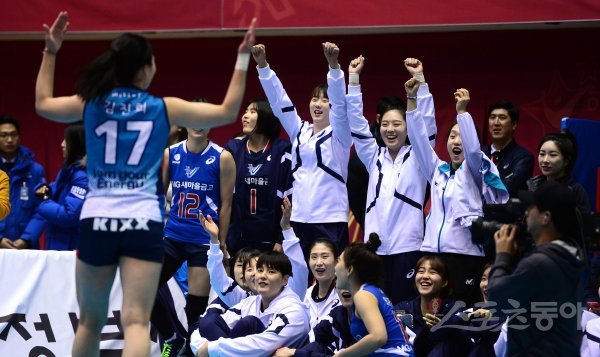 21일 경기도 의정부체육관에서 ‘2017-2018 도드람 V리그 올스타전’ K-스타와 V-스타의 경기가 열렸다. 서브퀸 컨테스트 예선전에서 김진희가 90km를 기록하자 동료들이 환호하고 있다.