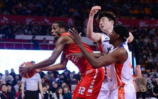 21일 서울 잠실실내체육관에서 열린 ‘2017-2018 정관장 프로농구’ 인천전자랜드와 서울SK 경기에서 SK 헤인즈가 전자랜드 브라운에 앞서 리바운드 볼을 잡고 있다.