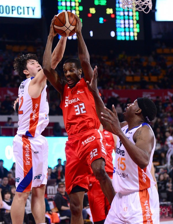 21일 서울 잠실실내체육관에서 열린 ‘2017-2018 정관장 프로농구’ 인천전자랜드와 서울SK 경기에서 SK 헤인즈가 전자랜드 정효근에 앞서 리바운드 볼을 잡고 있다.