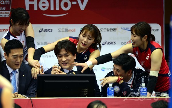 21일 경기도 의정부체육관에서 ‘2017-2018 도드람 V리그 올스타전’ K-스타와 V-스타의 경기가 열렸다. 강소휘, 이다영, 나현정이 경기감독관으로 나선 차상현 감독 판정을 방해하고 있다.