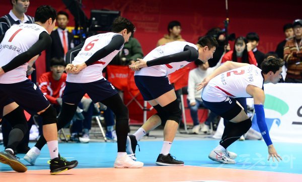 21일 경기도 의정부체육관에서 ‘2017-2018 도드람 V리그 올스타전’ K-스타와 V-스타의 경기가 열렸다. K-스타 선수들이 득점에 성공한 뒤 스케이팅 세리머니를 펼치고 있다.