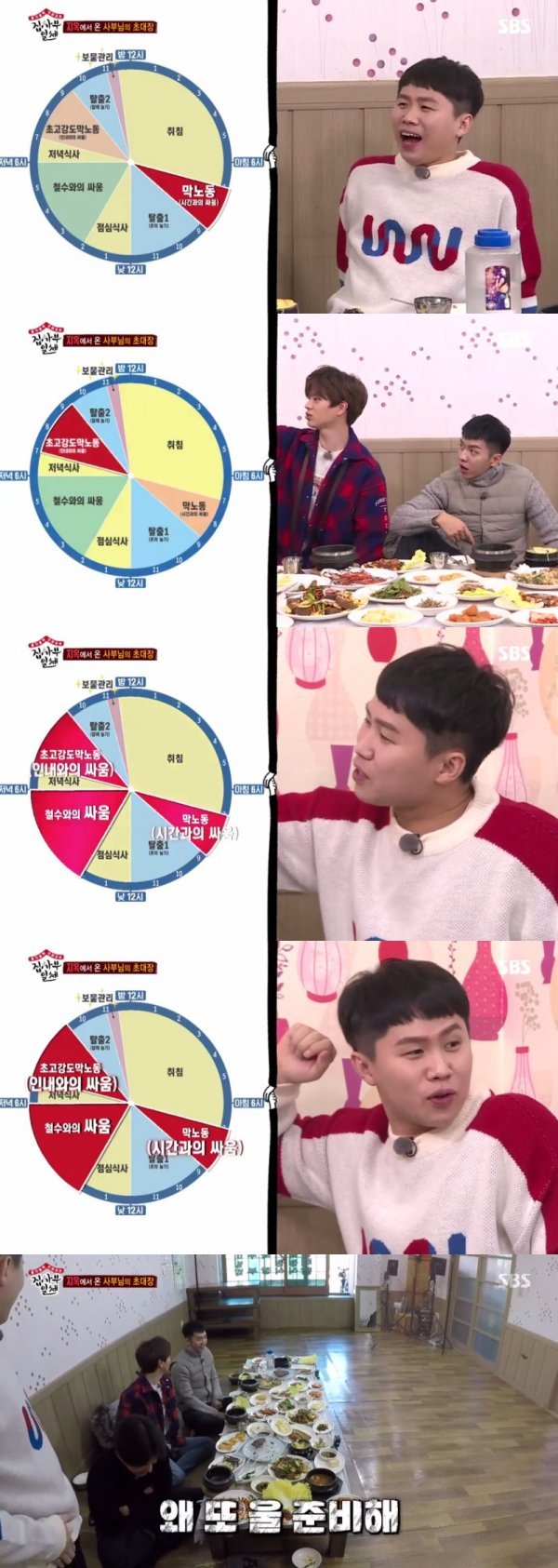 이날 멤버들은 사부님의 초대로 한 음식점에 도착했다. 이들은 밥을 반공기만 먹는 사부의 스타일을 보고 그의 정체를 추리했다. 또 사부의 시간표를 보며 그 안에 있는 ‘막노동’이라는 단어를 보고 기겁했다.