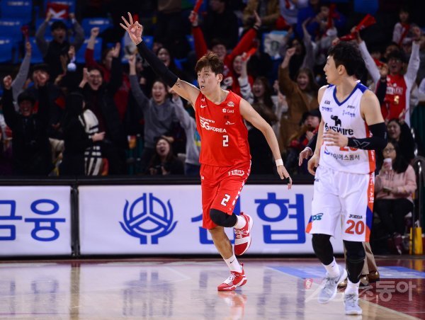 21일 서울 잠실실내체육관에서 열린 ‘2017-2018 정관장 프로농구’ 인천전자랜드와 서울SK 경기에서 4쿼터 종료 전 SK 최준용이 승리를 확정짓는 3점슛을 성공시킨 후 환호하고 있다.