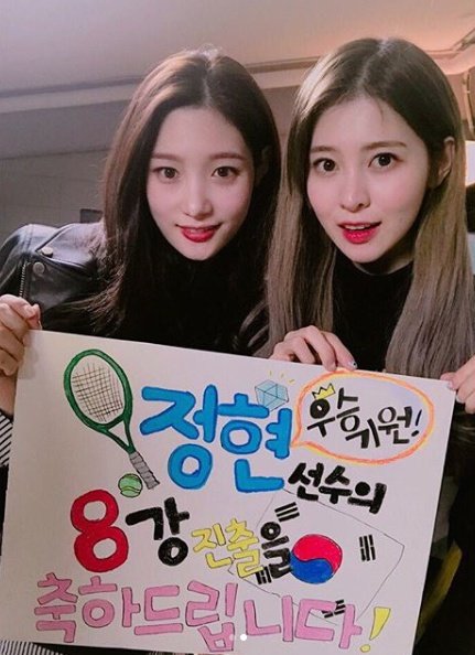 사진 속 다이아 정채연과 예빈은 \'정현 선수의 8강 진출을 축하 드립니다. 우승 기원\'이라고 쓰인 팻말을 들고 있다. 알록달록 직접 작성한 듯 한 팻말과 귀여운 두 멤버의 포즈가 눈길을 끌었다.