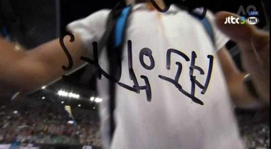 정현은 22일 호주 오픈 16강전에서 승리 후 카메라 렌즈에 매직으로 ‘보고있나’라는 글을 적는 세리머니를 했다.
