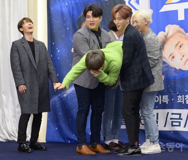 슈퍼주니어 은혁(가운데)이 23일 서울 마포구 상암동 스탠포드 호텔 서울에서 열린 XtvN ‘슈퍼TV’ 제작발표회에서 멤버들의 도움을 받아 슈퍼맨 포즈를 취하고 있다.