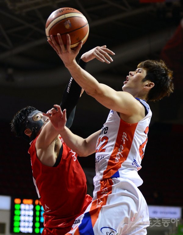 23일 경기도 안양실내체육관에서 열린 ‘2017-2018 정관장 프로농구’ 안양 KGC와 인천 전자랜드의 경기에서 전자랜드 김상규가 KGC 양희종의 수비를 피해 슛을 쏘고 있다.