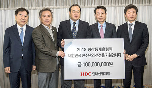 정몽규 HDC현대산업개발 회장(사진·맨 오른쪽)은 23일 이기흥 대한체육회장, 이재근 선수촌장, 전충렬 사무총장, 김지용 평창동계올림픽 선수단장 등이 참석한 격려금 전달식에서 선수단에 1억원을 전달했다. 정 회장은 “마지막까지 최선을 다하는 모습으로 대한민국 국민에게 큰 기쁨을 안겨주시길 바란다”고 말했다.