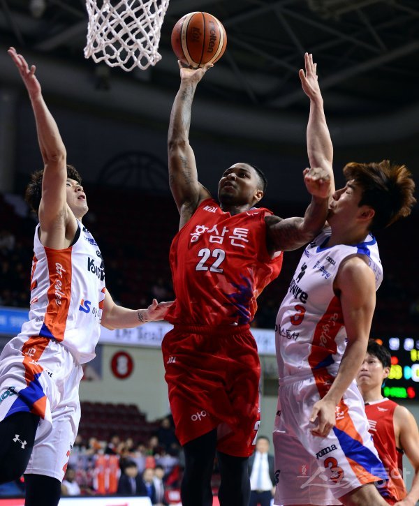 23일 경기도 안양실내체육관에서 열린 ‘2017-2018 정관장 프로농구’ 안양 KGC와 인천 전자랜드의 경기에서 KGC 피터슨이 전자랜드 수비를 피해 슛을 쏘고 있다.
