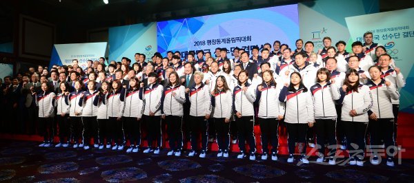 24일 서울 송파구 방이동 올림픽파크텔에서 열린 2018 평창동계올림픽 선수단 결단식에서 귀빈과 아이스하키 선수단이 기념촬영을 하고 있다.
