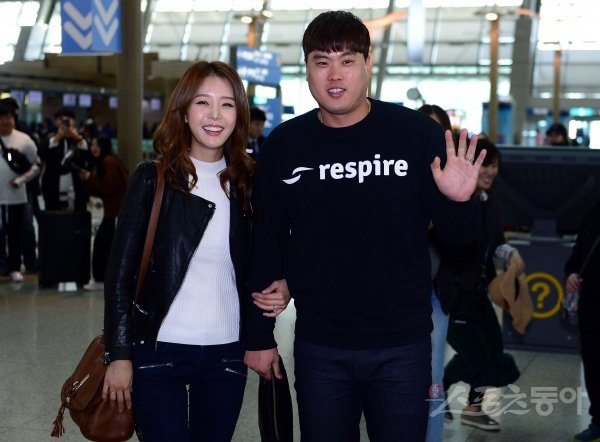 출국에 앞서 류현진과 배지현이 카메라를 향해 포즈를 취하고 있다.