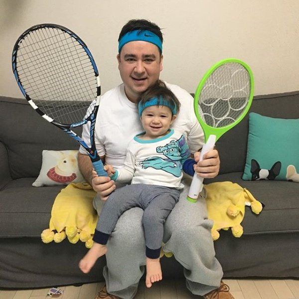 사진 속에는 샘 해밍턴과 윌리엄이 헤어 밴드를 쓰고 포즈를 취하고 있다. 특히, 윌리엄이 테니스 라켓과 비슷한 모양의 모기채를 잡고 있어 귀여움을 자아냈다.