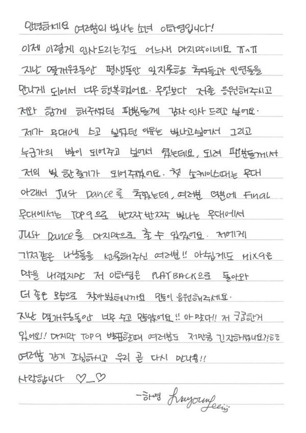 JTBC 오디션 프로그램 ‘믹스나인’이 지난 26일 파이널 경연을 끝으로 막을 내린 가운데 출연 하는 내내 탄탄한 실력과 팔색조 매력을 발산하며 많은 사랑을 받았던 걸그룹 플레이백 멤버 이하영이 어제(28일) 공식 SNS를 통해 자신을 응원해준 팬들에게 전하는 친필 감사 메시지를 게시해 눈길을 모으고 있다.