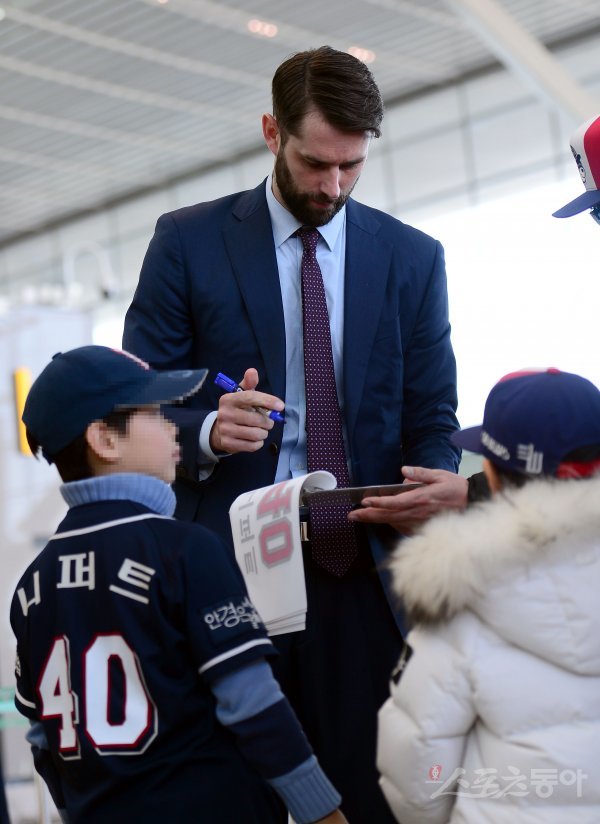 kt 니퍼트가 두산 팬들에게 사인을 하고 있다.