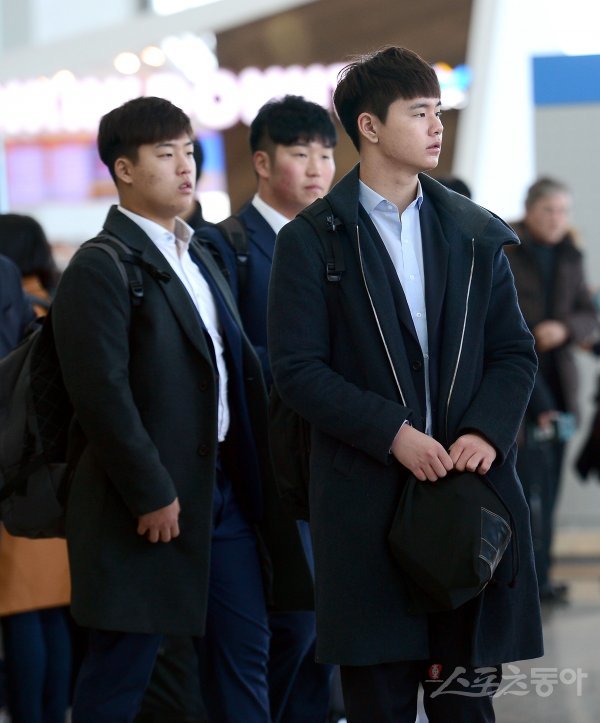 kt 신인 김민(오른쪽)과 강백호가 출국 준비를 하고 있다.