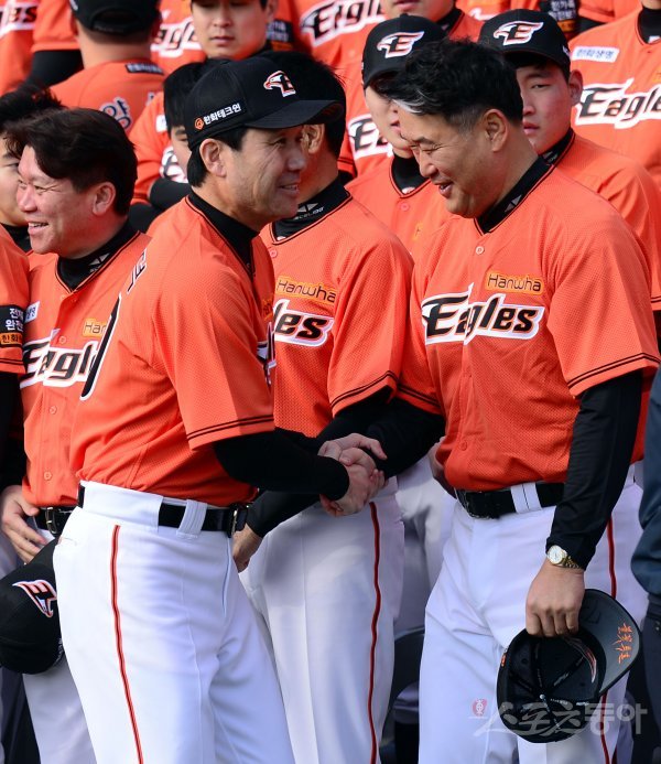 29일 대전 한화생명 이글스파크에서 ‘2018 한화 포토데이’가 열렸다. 한화 한용덕 감독이 장종훈 코치와 악수를 나누고 있다.