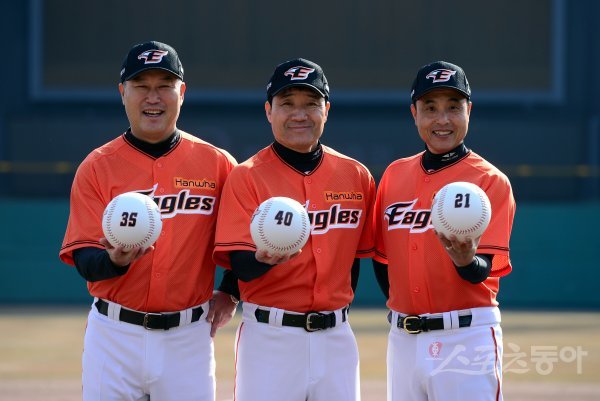 29일 대전 한화생명 이글스파크에서 ‘2018 한화 포토데이’가 열렸다. 한화 레전드 장종훈 코치, 한용덕 감독, 송진우 코치가 선수 때 등번호가 적힌 야구공을 들고 카메라를 향해 포즈를 취하고 있다.