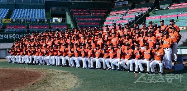 29일 대전 한화생명 이글스파크에서 ‘2018 한화 포토데이’가 열렸다. 한용덕 감독과 선수 및 코치들이 카메라를 향해 포즈를 취하고 있다.