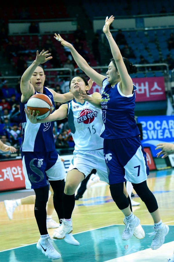 29일 부천체육관에서 열린‘신한은행 2017∼2018 여자프로농구‘ 신한은행과 KEB하나은행 경기에서 KEB하나은행 서수빈이 신한은행 윤미지의 수비를 뚫고 골밑슛을 하고 있다.