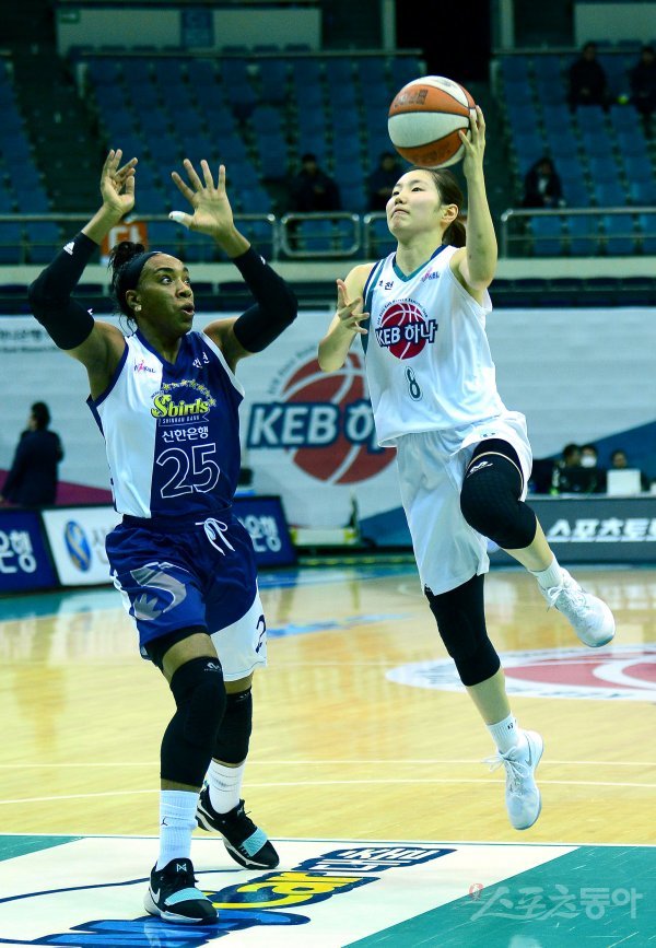 29일 부천체육관에서 열린‘신한은행 2017∼2018 여자프로농구‘ 신한은행과 KEB하나은행 경기에서 김지영이 신한은행 쏜튼의 수비를 뚫고 골밑슛을 하고 있다.