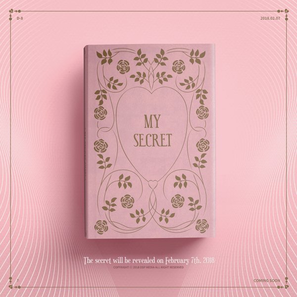 이날 공개된 이미지는 핑크톤의 배경과 더불어, 중앙에 놓인 다이어리 커버에는 ‘MY SECRET’이라는 문구가 적혀 있다. 또, ‘D-8’, ‘2018.02.07’, ‘The secret will be revealed on February 7th, 2018’라는 컴백 시기로 추정되는 날짜가 담겨 있다.