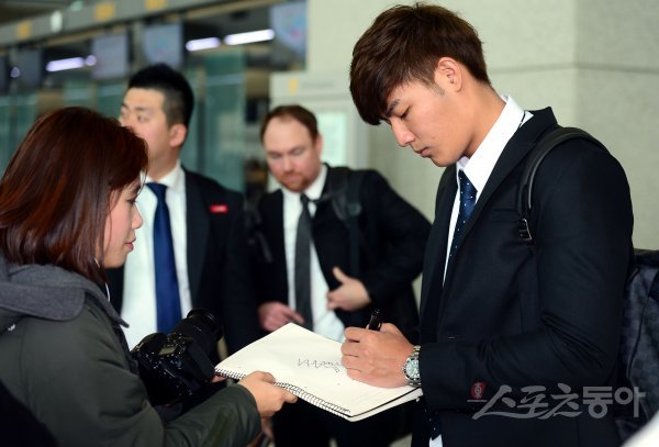 대만 출신 왕웨이중이 출국을 앞두고 여성팬에게 사인을 하고 있다.