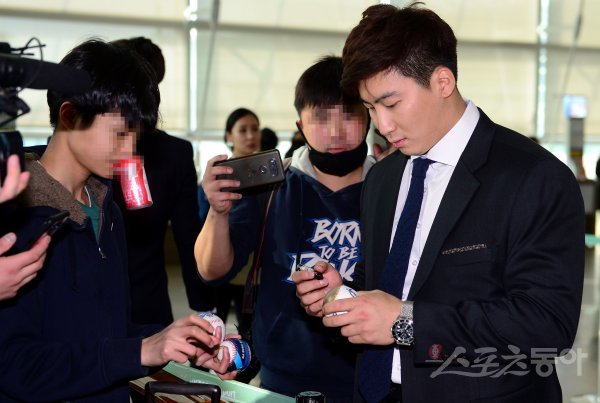 나성범이 출국을 앞두고 팬들에게 사인을 하고 있다.
