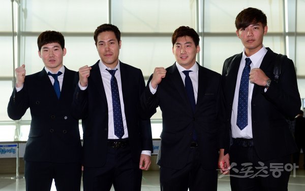 박민우, 김진성, 나성범, 왕웨이중이 출국을 앞두고 카메라를 향해 포즈를 취하고 있다.