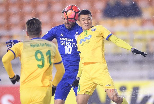 30일 수원월드컵경기장에서 2018 AFC 챔피언스리그 플레이오프 수원삼성과 탄호아(베트남)의 경기가 열렸다. 전반 수원삼성 데얀이 탄호아 수비와 헤딩 경합을 벌이고 있다.