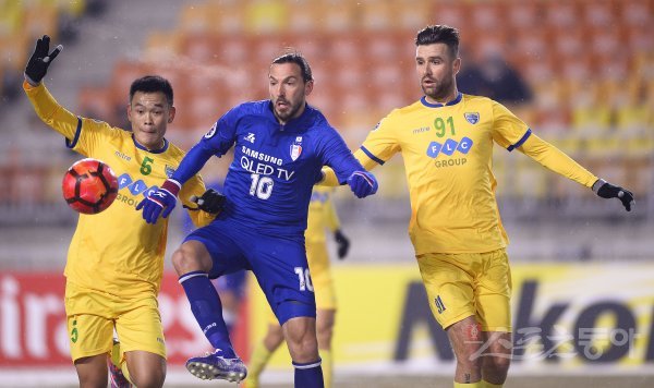 30일 수원월드컵경기장에서 2018 AFC 챔피언스리그 플레이오프 수원삼성과 탄호아(베트남)의 경기가 열렸다. 전반 수원삼성 데얀이 탄호아 선수들과 볼 경합을 벌이고 있다.