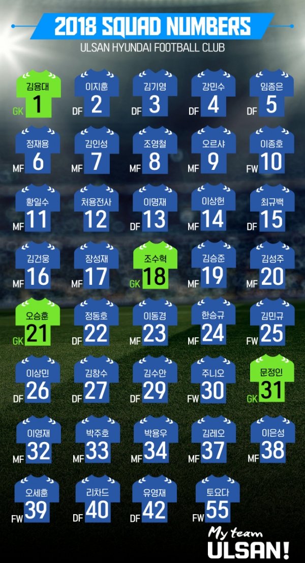 프로축구 K리그1 울산현대축구단의 2018시즌 등번호가 확정되었다. 이번시즌 울산은 새롭게 합류한 선수들을 포함해 무려 22명의 선수가 새로운 번호를 선택하며 ‘변화’와 ‘초심’의 의미를 담았다.