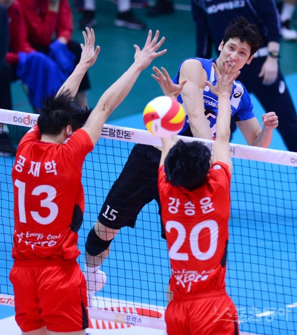 31일 수원실내체육관에서 열린 ‘2017-18 도드람 V리그’ 남자부 현대캐피탈과 한국전력의 경기에서 현대캐피탈 문성민이 한국전력의 블로킹을 앞에 두고 스파이크 공격을 하고 있다.