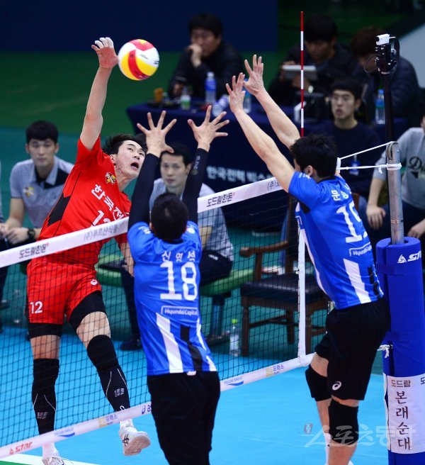 31일 수원실내체육관에서 열린 ‘2017-18 도드람 V리그’ 남자부 현대캐피탈과 한국전력의 경기에서 한국전력 전광인이 현대캐피탈의 블로킹을 앞에 두고 스파이크 공격을 하고 있다.