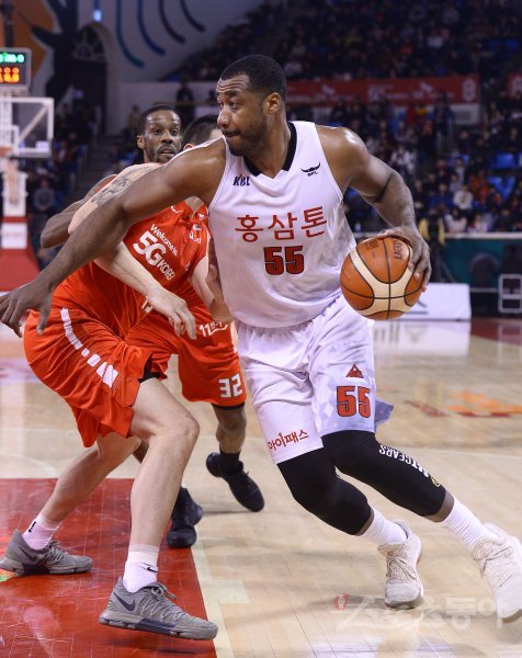 3일 잠실학생체육관에서 열린 ‘2017-2018 정관장 프로농구’ 안양 KGC와 서울 SK 경기에서 안양 KGC 사이먼이 서울 SK 김민수의 수비를 뚫고 골밑 돌파를 하고 있다.