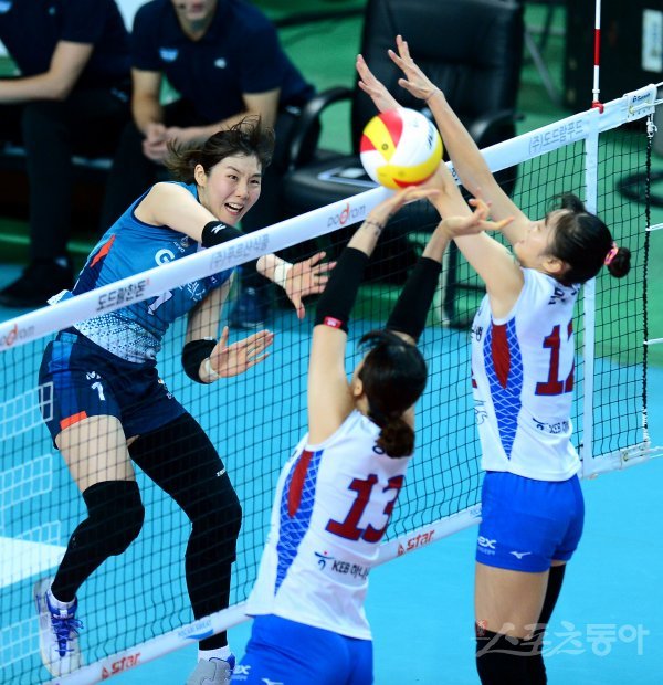 4일 서울 장충체육관에서 열린 ‘2017-18 도드람 V리그’ 여자부 도로공사와 GS칼텍스 경기에서 GS칼텍스 이소영이 도로공사의 블로킹을 앞에 두고 스파이크 공격을 하고 있다.