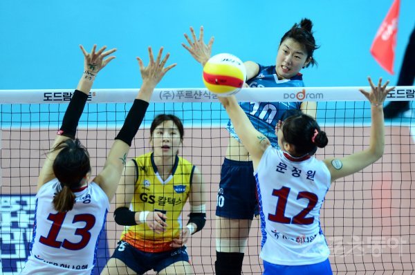 4일 서울 장충체육관에서 열린 ‘2017-18 도드람 V리그’ 여자부 도로공사와 GS칼텍스 경기에서 GS칼텍스 강소휘가 도로공사의 블로킹을 앞에 두고 스파이크 공격을 하고 있다.