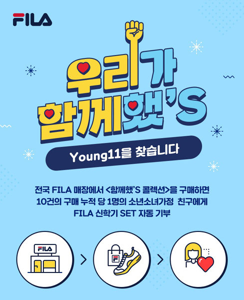 ‘함께 했’S 컬렉션’ 제품 누적판매 10건당 전국 소년소녀가정 1세대에 휠라가 준비한 ‘신학기 세트’를 지원하는 일명 ‘영일레븐 프로젝트’를 통해 진행된다. 이 컬렉션은 포스 백팩, 링크 백팩, 휠라레이, 에프엑스 벨트랩 슈즈, 휠라 아웃핏 언더웨어 등 신학기 필수품으로 구성했다.