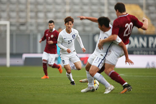 이재성이 3일(한국시간) 터키 마르단스타디움에서 열린 라트비아와의 평가전에서 볼을 빼앗기 위해 상대 선수를 향해 달려가고 있다. 우리 대표팀은 이번 터키 전지훈련 3차례 평가전에서 2승1무의 성과를 거뒀다. 이재성은 클래스가 다른 활약을 하며 대표팀의 대표선수로 자리매김 했다. 사진제공 | 대한축구협회
