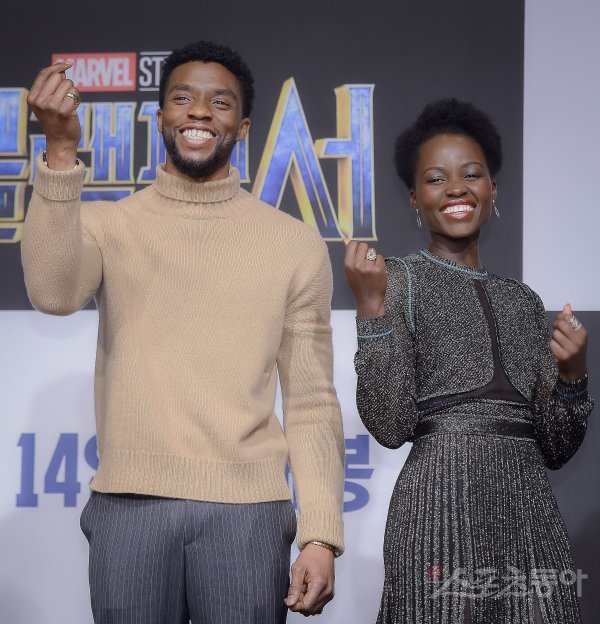 배우 채드윅 보스만과 루피타 뇽(오른쪽)이 5일 서울 종로구 세종로에 위치한 포시즌스 호텔 서울에서 열린 영화 ‘블랙팬서’ 아시아 프레스 컨퍼런스에 참석해 포즈를 취하고 있다.
