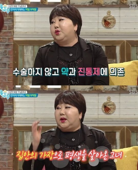 이어 “이어 “2~3개월 만에 20kg 정도 쪘다. 공연 중에 허리를 다쳤고 통증이 심해 스테로이드 약을 3년 가량 복용했다. 너무 심할 때는 주사까지 맞았다. 그런데 몇 달만에 갑자기 이렇게 됐다”라고 덧붙였다. 또한 사람들이 안 봤으면 하는 마음에 안경을 쓰고 다녔다고 말하기도 했다.
