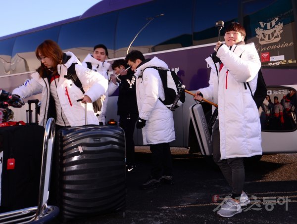 2018평창동계올림픽 쇼트트랙 대표팀이 5일 강원도 강릉선수촌에 입촌하고 있다. 서이라가 카메라로 취재진을 찍고 있다.